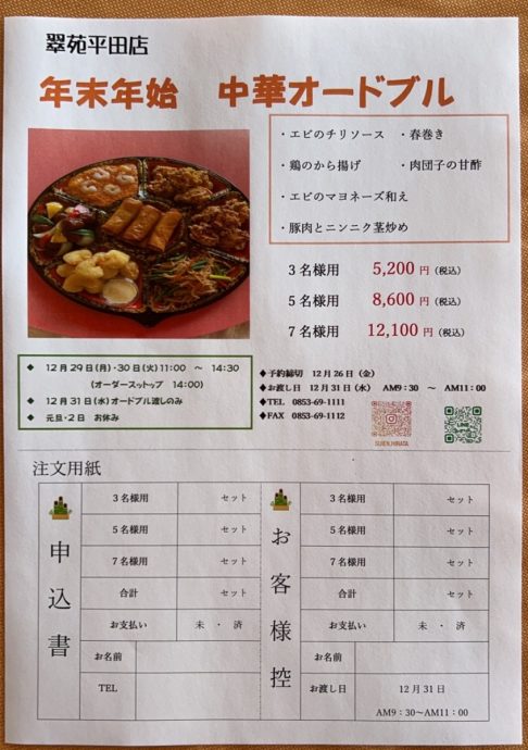 ホーム NEWS年末年始は中華オードブルはいかがですか?! 年末年始は中華オードブルはいかがですか?! 2025.11.06 慌ただしい年の瀬、新年は、美味しい中華オードブルで過ごしませんか? 今年も美味しいオードブルを用意しています。 ご予約お待ちしています! « 営業日のお知らせ 12月 営業のお知らせ » 最近の記事 12月 営業のお知らせ 年末年始は中華オードブルはいかがですか?! 営業日のお知らせ 翆苑特製恵方巻 月間アーカイブ 2025年11月 2025年7月 2025年1月